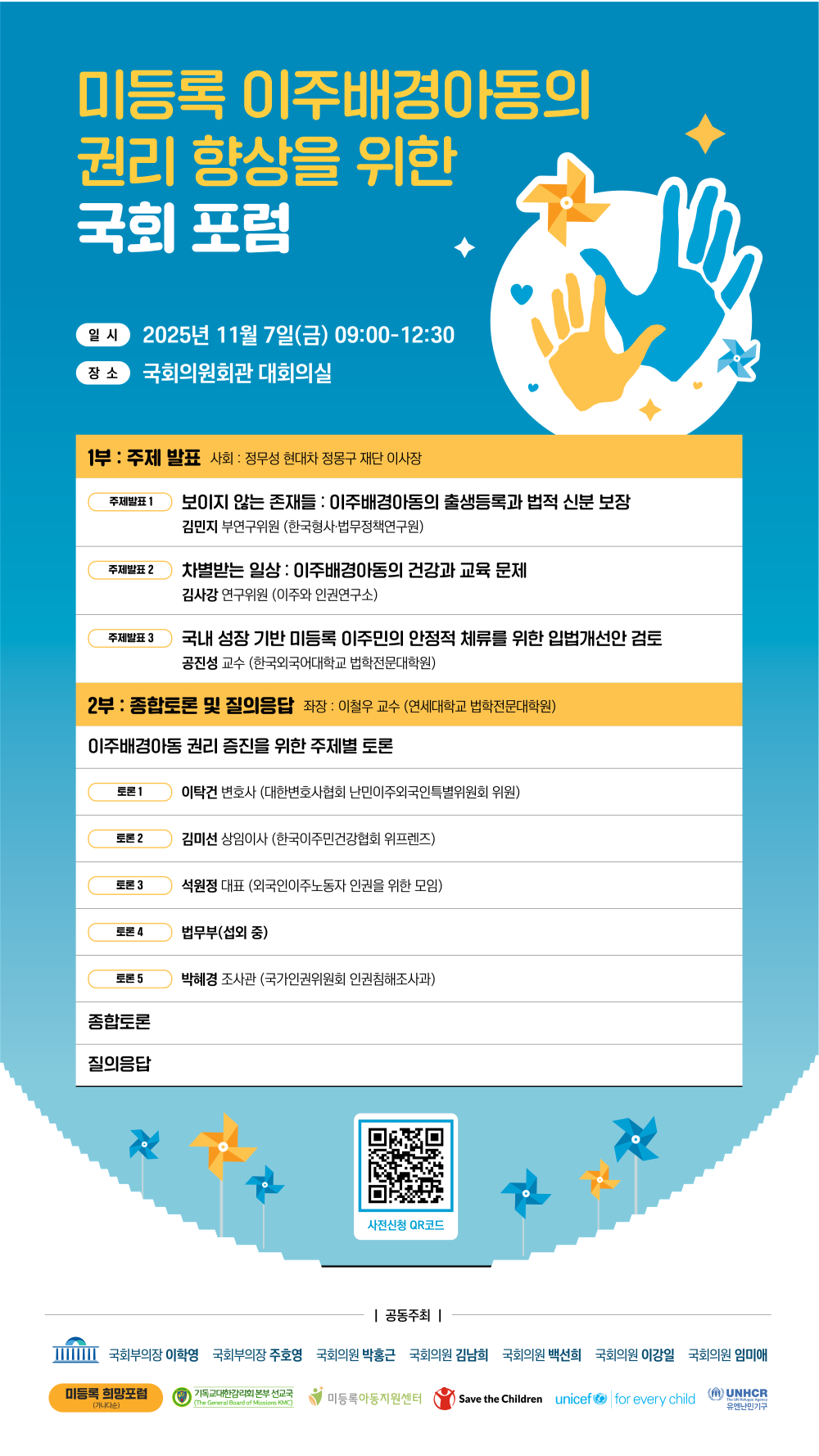 이번 포럼에서는 지금까지의 제도 변화를 짚고, 미등록 아동이 온전히 ‘아동’으로 성장할 수 있도록 하기 위한 입법·제도 개선 방향을 논의할 예정입니다.